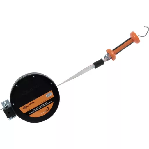 Speciális kapukilincs készlet. A kerítés egyszerű nyitása talajérintkezés nélkül. A 40 mm széles szalag felnyitáskor automatikusan feltekercselődik, 15 méteres fehér szalaggal 15 méteres teljes készletre kiterjeszthető. Kapukilincs és akasztókampó.
