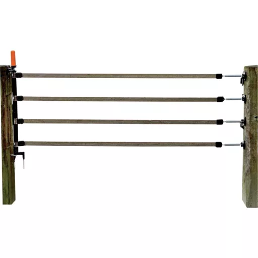 Komplett készlet a szélessávú többvezetékes kapu egyszerű összeszereléséhez. Olcsó megoldás gyakorlatilag minden ajtószélességhez. Ez a 6 méteres 40 mm-es szalaggal ellátott kapukészlet különösen alkalmas lókerítésekhez.